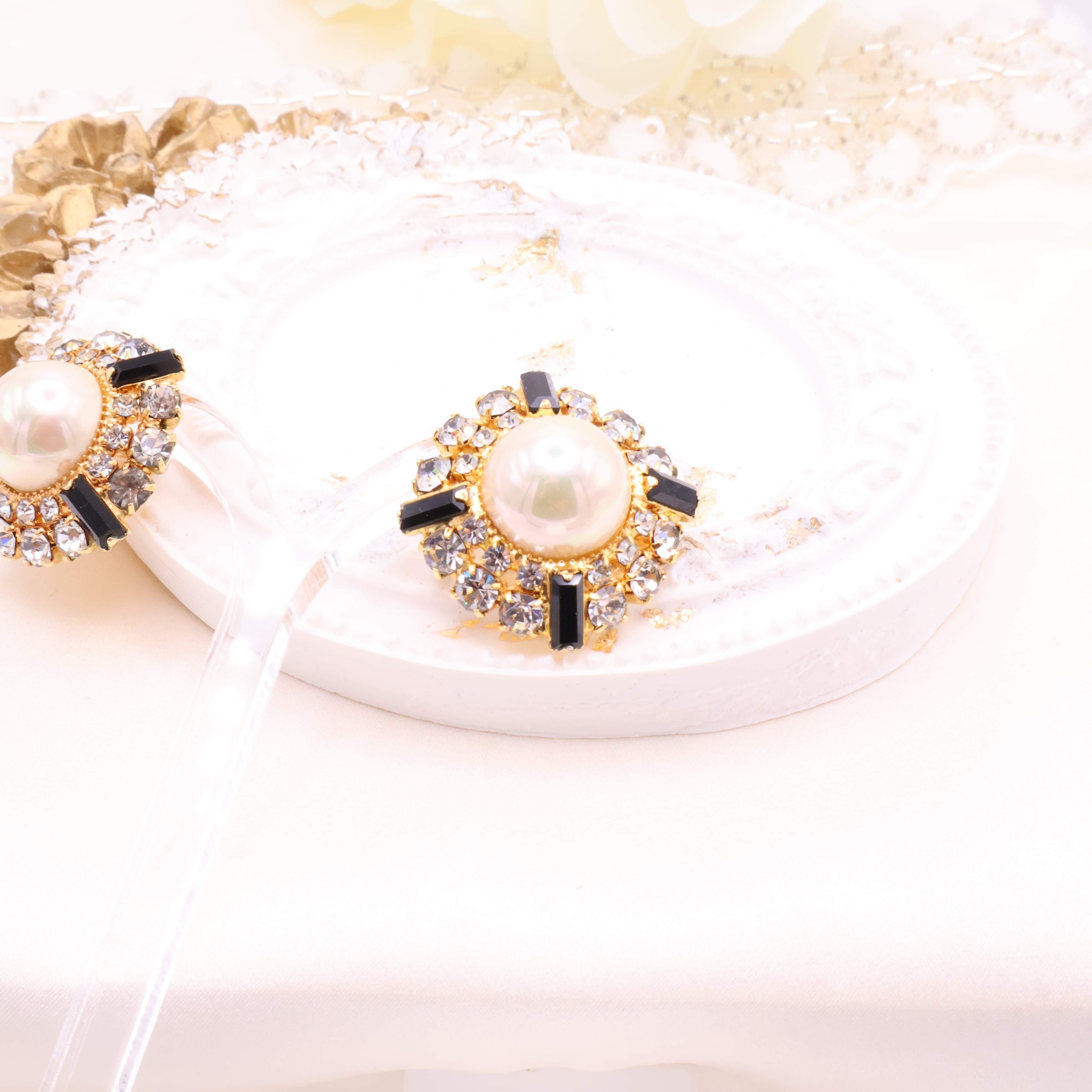 艶やかなパール調ストーンを中心に、周囲を取り囲むクリアラインストーンが華やかにきらめき、そこにブラックストーンが花弁のようなアクセントを添えるデザインです。