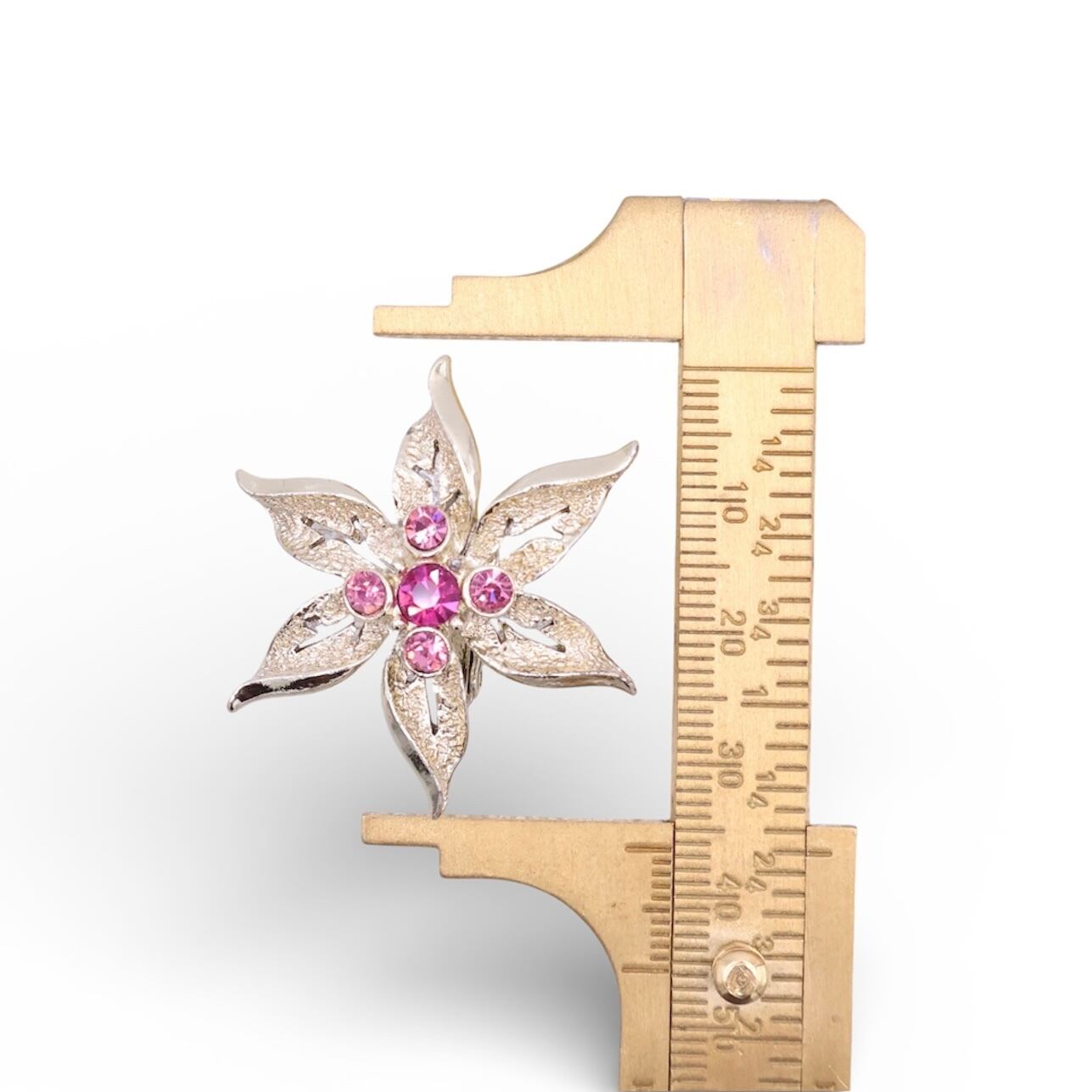 繊細な空洞の葉脈表現が施されたシルバートーンのフラワーモチーフに、中央から放射状に配されたピンクラインストーンが華やかなアクセントを添えています。