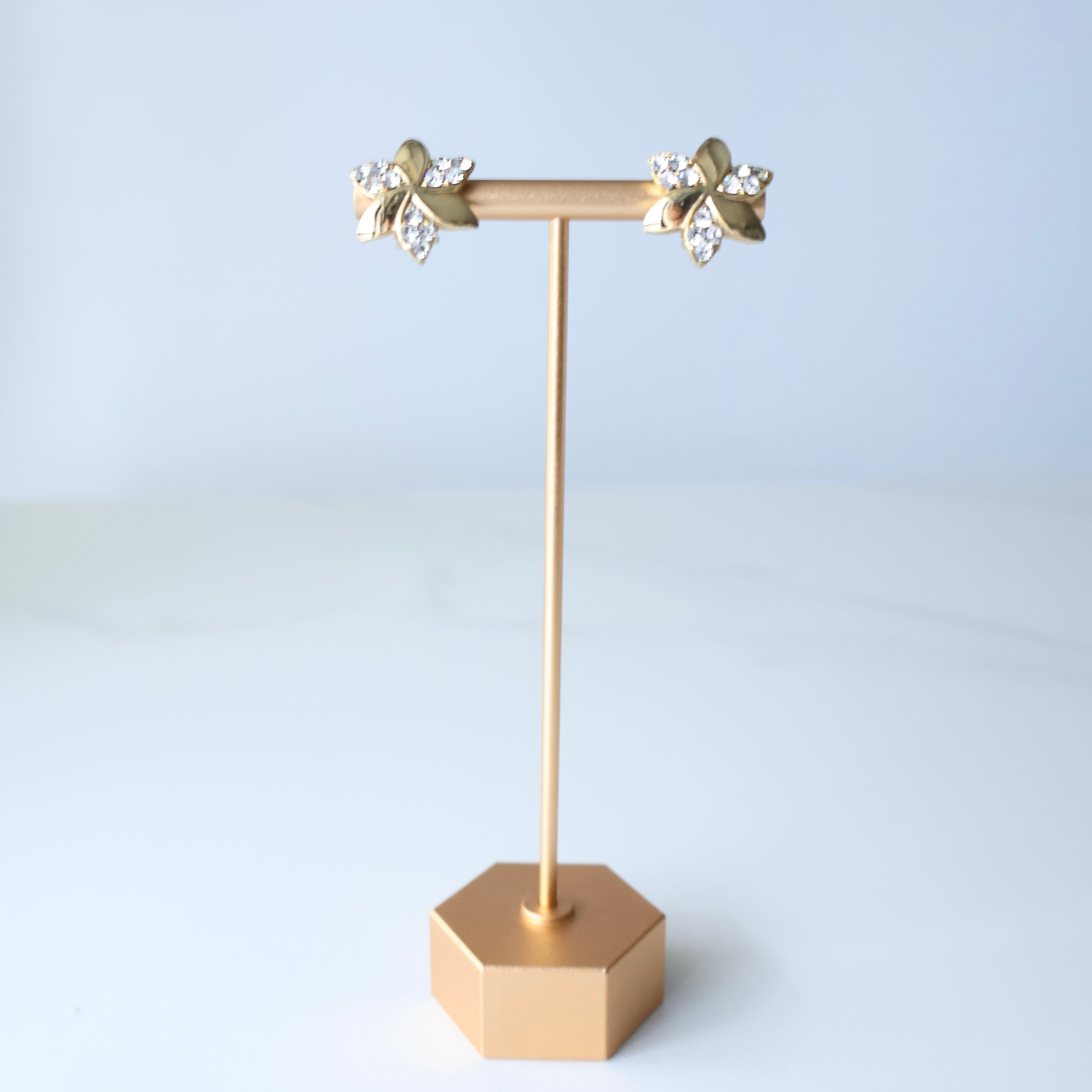 小ぶりながらも立体感のあるフラワーモチーフ。ゴールドトーンの艶とクリアラインストーンの輝きが、顔まわりを明るく華やかに演出します。ホワイトやベージュのブラウスに合わせると、上品で柔らかな印象に。