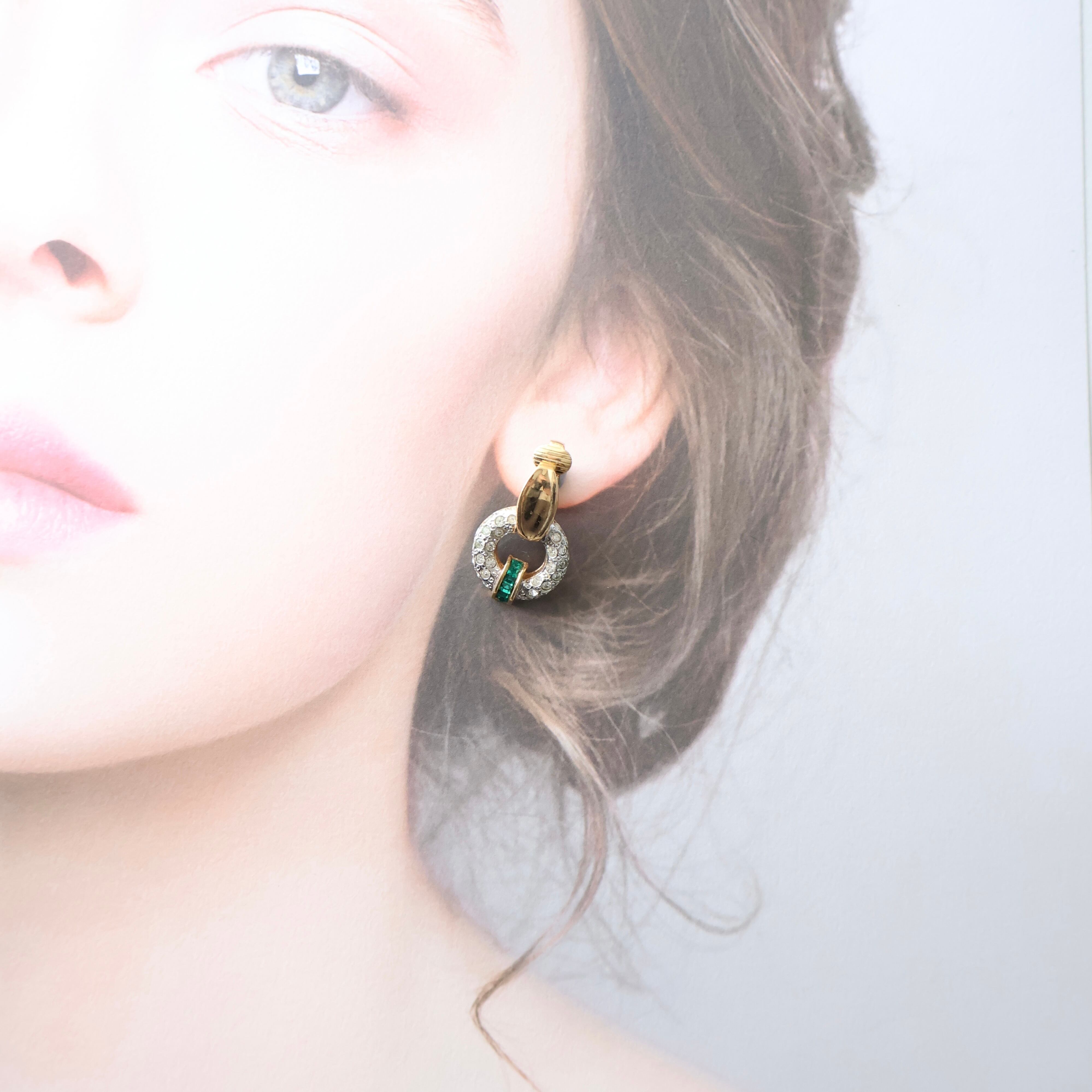 クリアラインストーンが敷き詰められたフープデザインに、鮮やかなグリーンストーンがアクセントとして配された華やかなイヤリング。シンプルなジャケットやシャツスタイルに合わせると、洗練されたヴィンテージ感を演出します。