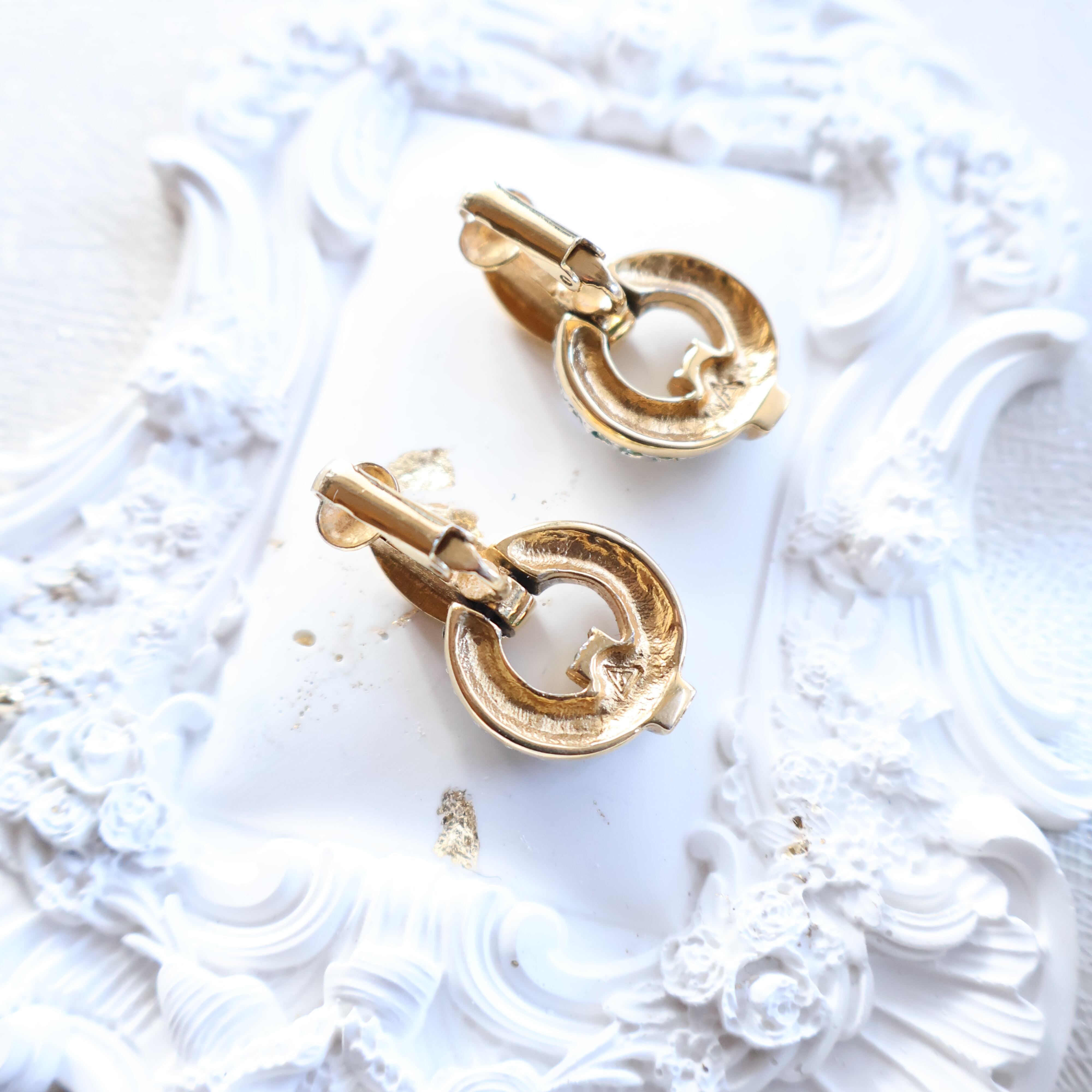 ブラックやネイビーのワントーンコーデに合わせると、ラインストーンの輝きとグリーンストーンのアクセントが際立ち、耳元に上品な華やかさを添えてくれます。ヴィンテージらしい存在感を楽しめるデザインです。