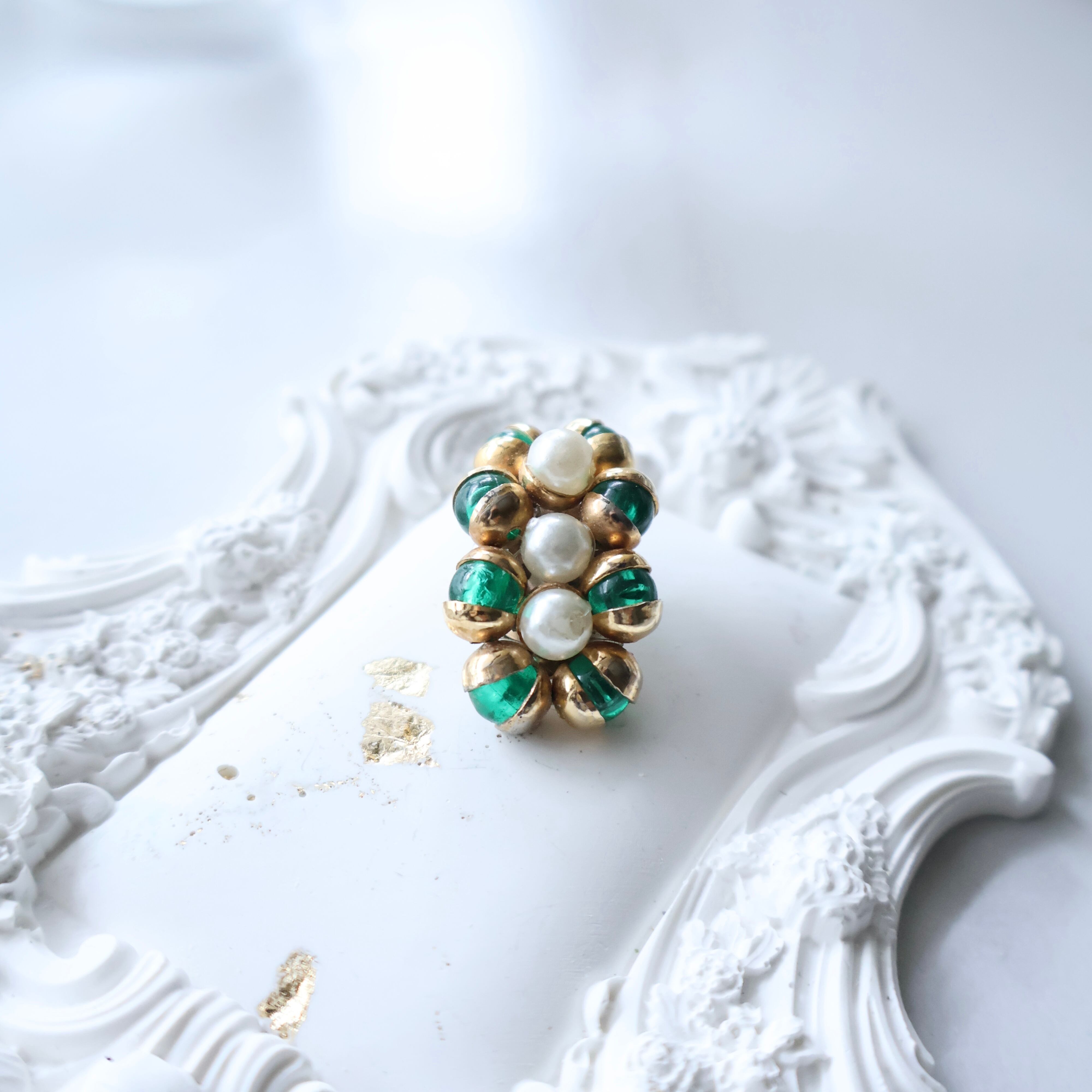 【フランス買付】1960s-1970s ヴィンテージ グリーンルーサイト × パール イヤリング*クラスターデザイン