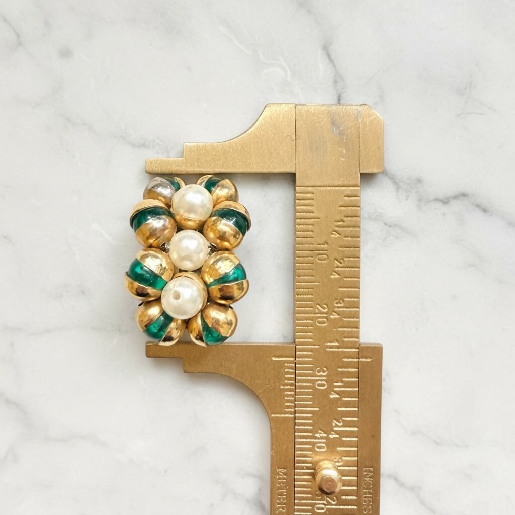 ・素材: メタル(ゴールドトーン)/ルーサイト(グリーン樹脂)/フェイクパール