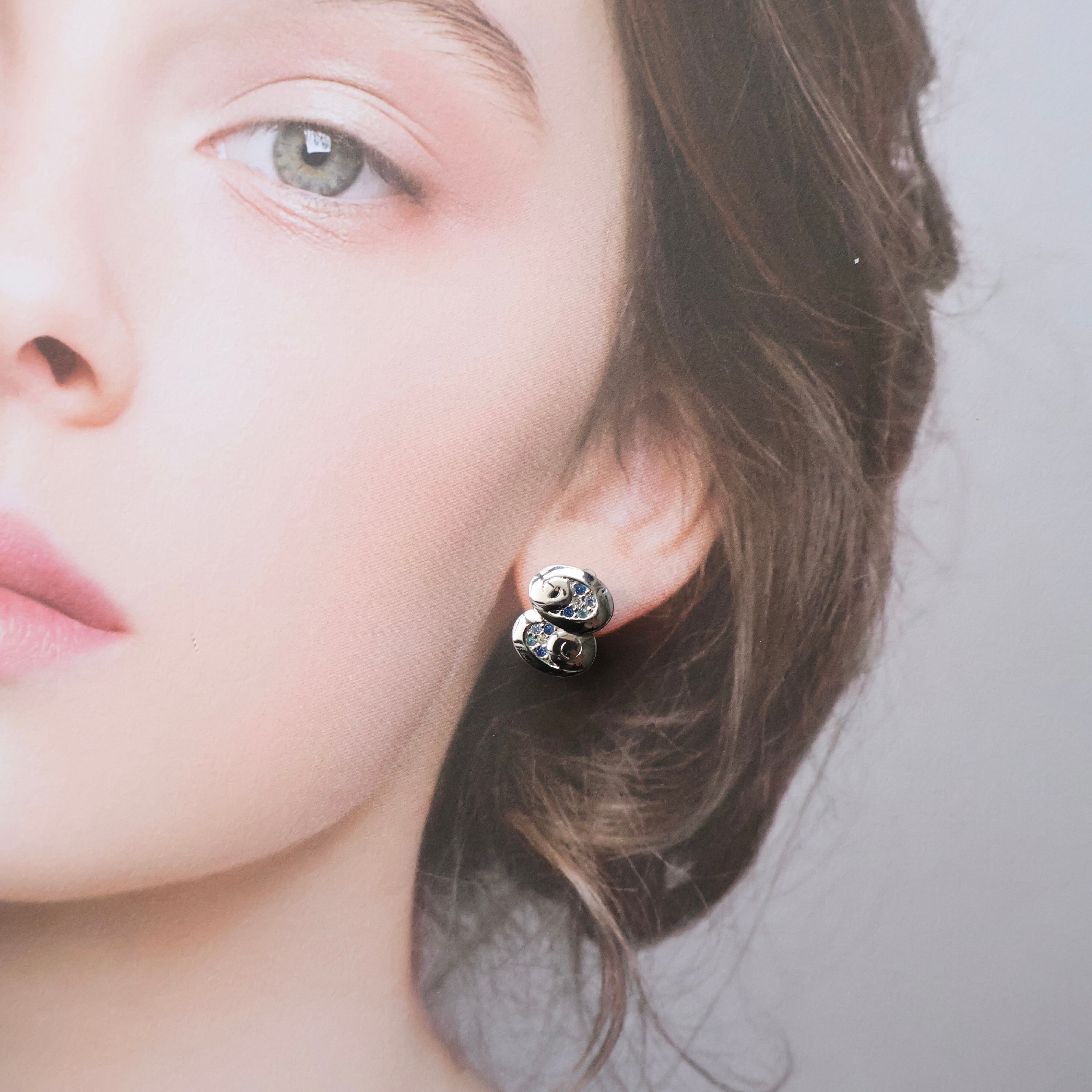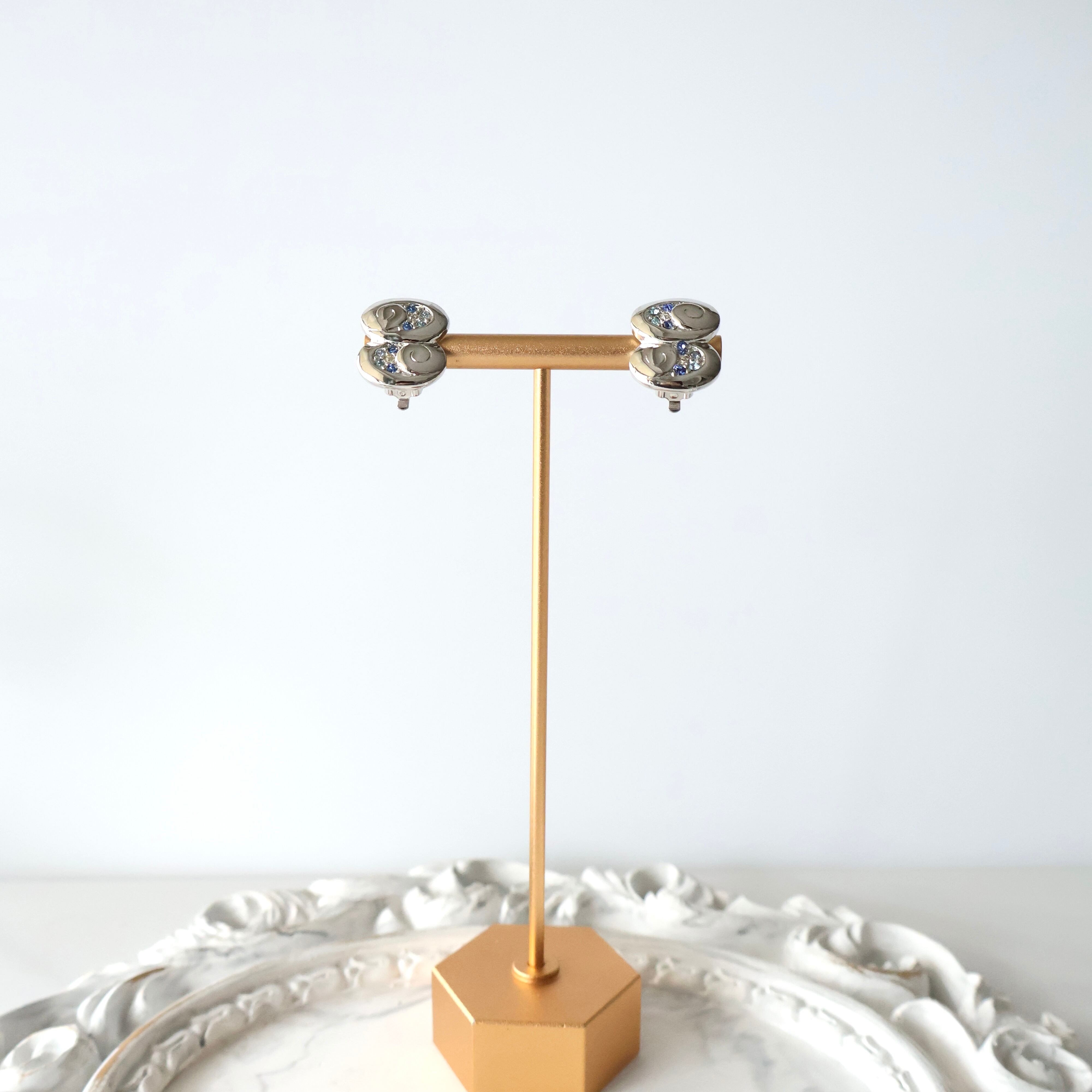 なめらかな曲線を描くオーバルフォルムと、ブルーとクリアのラインストーンが繊細にあしらわれたデザインが印象的です。