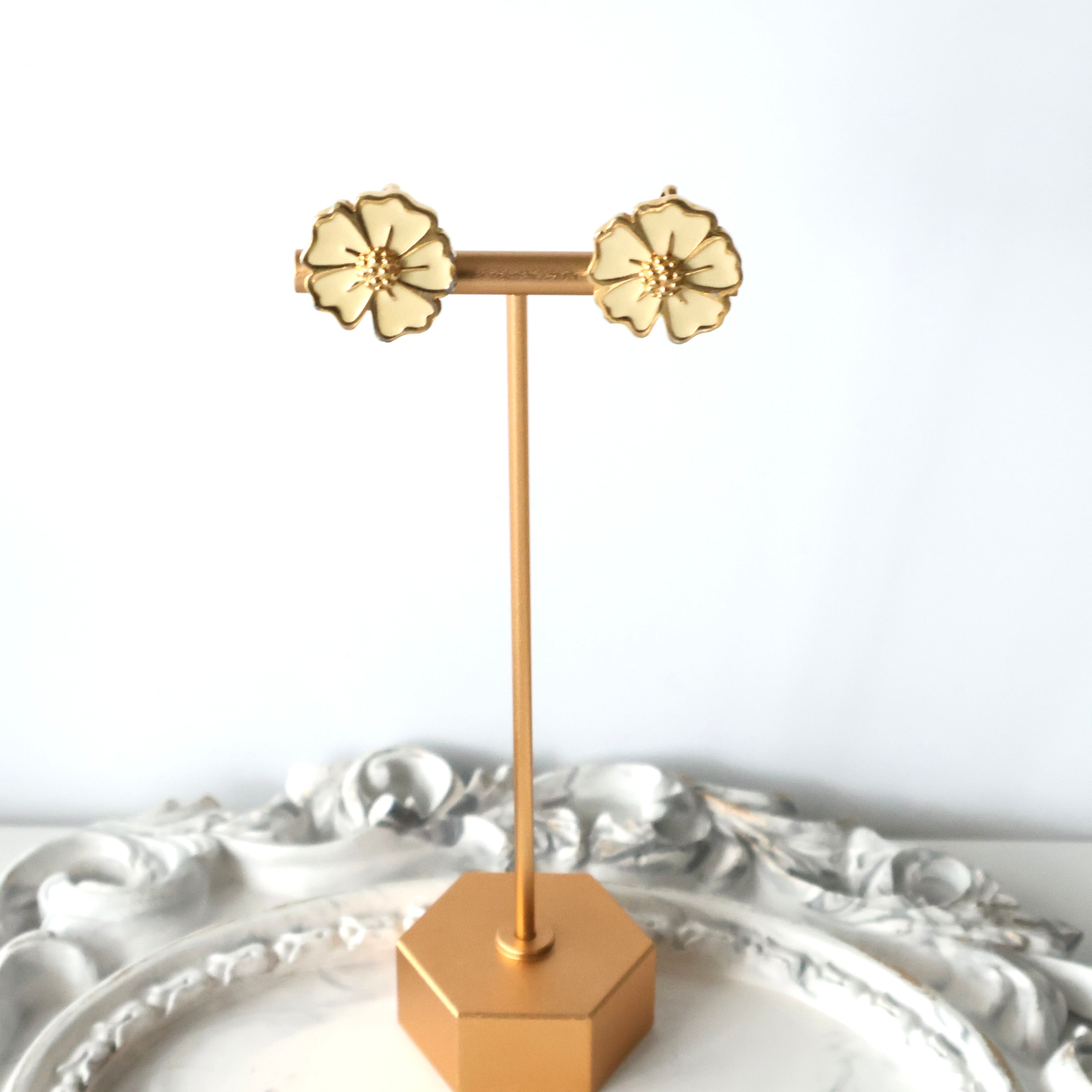 このイヤリングはアイボリーのエナメルとゴールドの組み合わせなので、柔らかさはありつつもどこか落ち着いた印象に。
