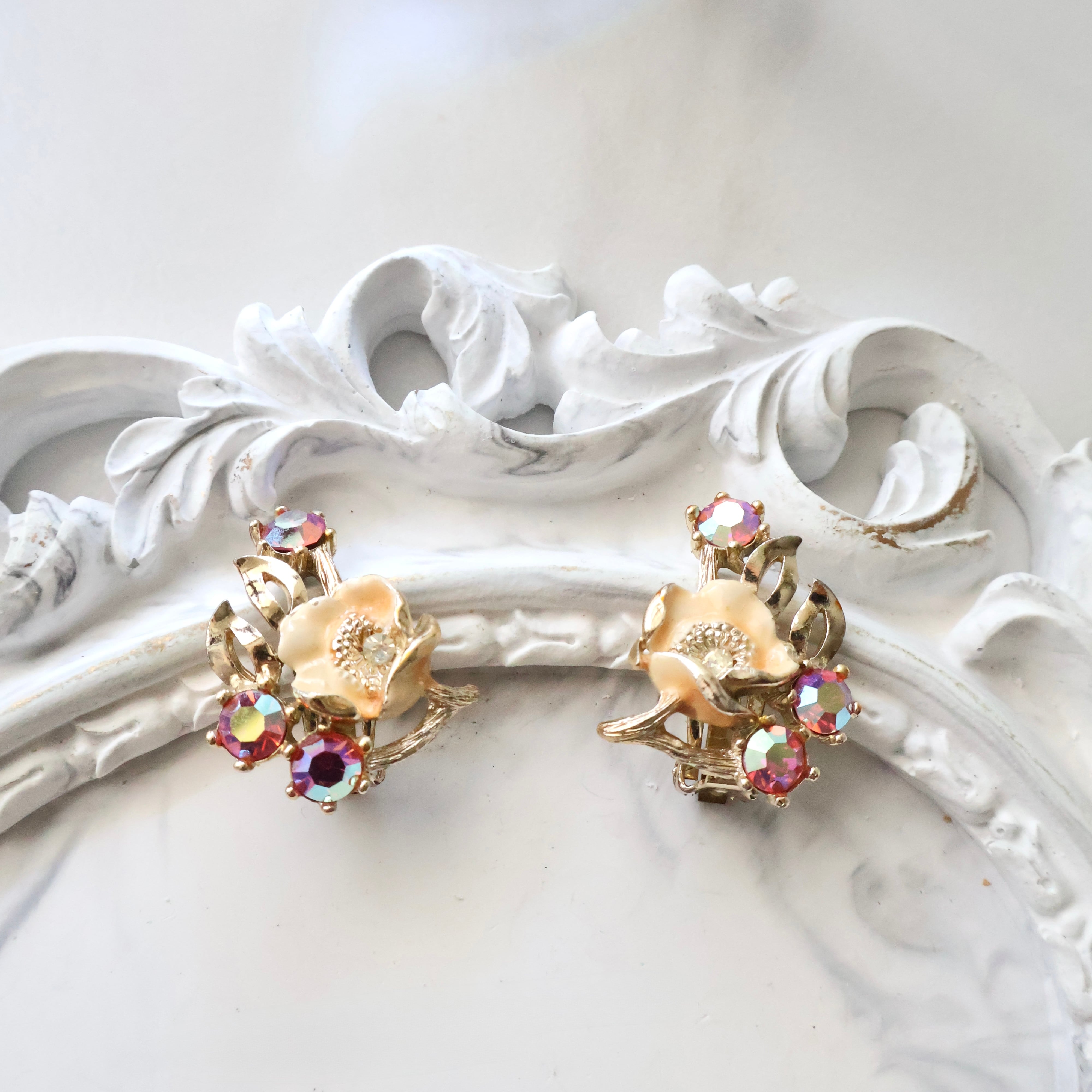 【LEDO】1960-70s ヴィンテージ フラワー×オーロラボレアリス クリップイヤリング